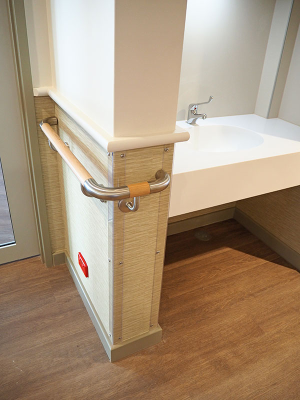 A 158mm high handrail, featuring an integrated Acrovyn crash rail with continuous shock absorbing bumper. The HRB-10CN Hand rail offers numerous design options allowing designers to integrate up to three different colourways in each handrail. Available with a psychiatric bracket enclosure to ensure patient safety.